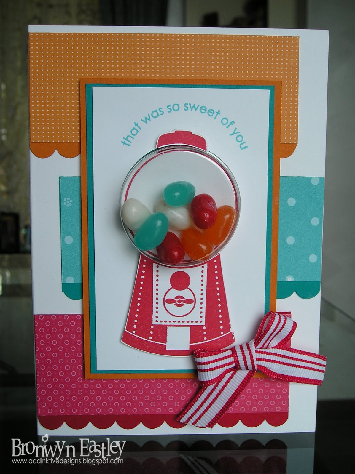Sixthly ... my daughter, Laura, wanted to crack open the huge packet of Jelly Belly, Jelly Beans that I had bought especially to use with this stamp. The packet had 49 flavours ... and yes it was fun trying to find the colours to match the challenge - flavours being, Red Apple, Orange Juice, Berry Blue and French Vanilla. Yum!