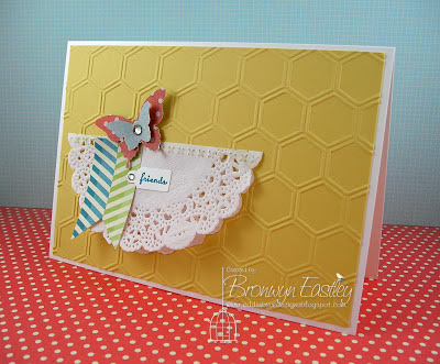 Autumn Seasonal Mini: Paper Doily, Honeycomb Embossing Folder, Needlepoint Border Embossing Folder, Tea For Two DSP, Hearts a Flutter Framelits, Bitty Butterfly Punch.